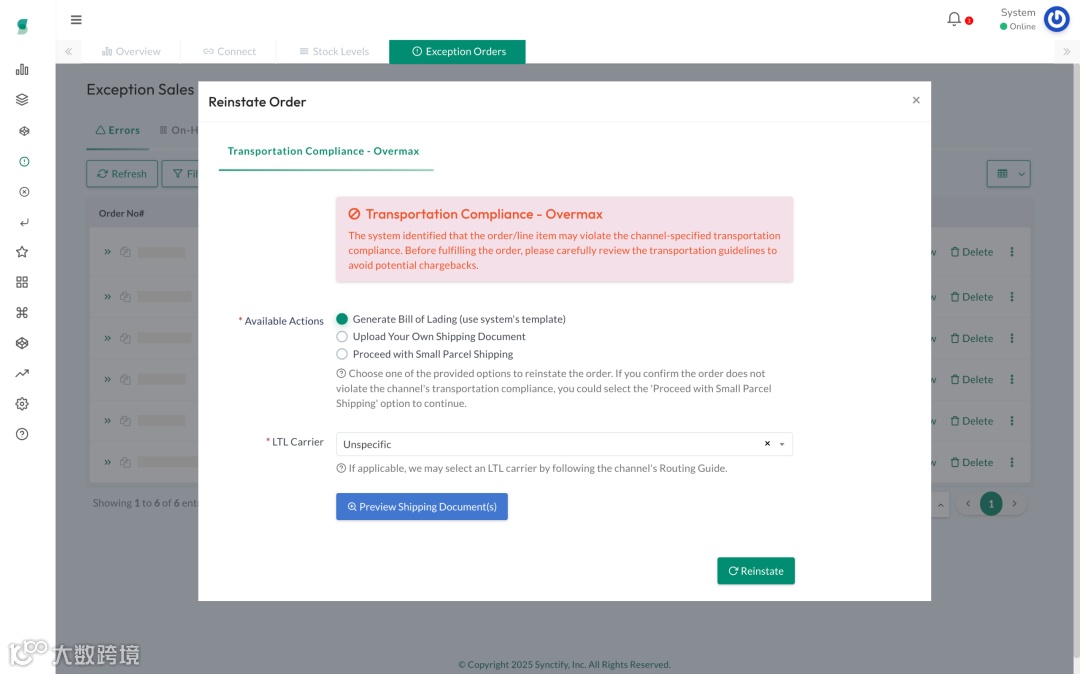 Synctify ERP 自动检测运输合规问题,并提示用户生成或上传合规的提单(BOL)。