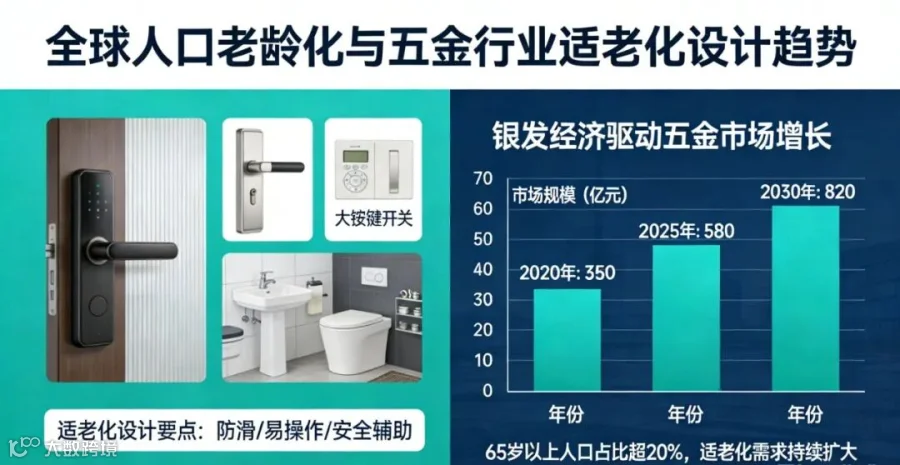 全球人口老龄化趋势加剧,推动五金产品的适老化与人性化设计成为新的市场蓝海,银发经济正成为五金行业的全新增长点。在建筑、家装领域,适老化扶手、防滑五金配件、无障碍门锁、缓降合页等产品成为老旧小区改造、养老设施建设、高端康养社区的刚需;在工具领域,一键操作、大手柄、防误触开关的智能工具,更适配老年人群的操作习惯。