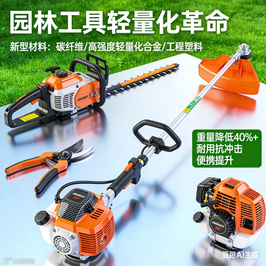 受全球户外休闲生活方式普及、家庭 DIY 文化兴起的影响,园林工具迎来全方位的轻量化革命,新型材料应用 + 结构优化成为技术升级的核心方向。碳纤维、高强度轻量化合金、工程塑料等新材料逐步替代传统钢材,让割草机、修枝剪、绿篱机等产品重量降低 40% 以上,在保证耐用性、抗冲击性的同时,大幅提升便携性。