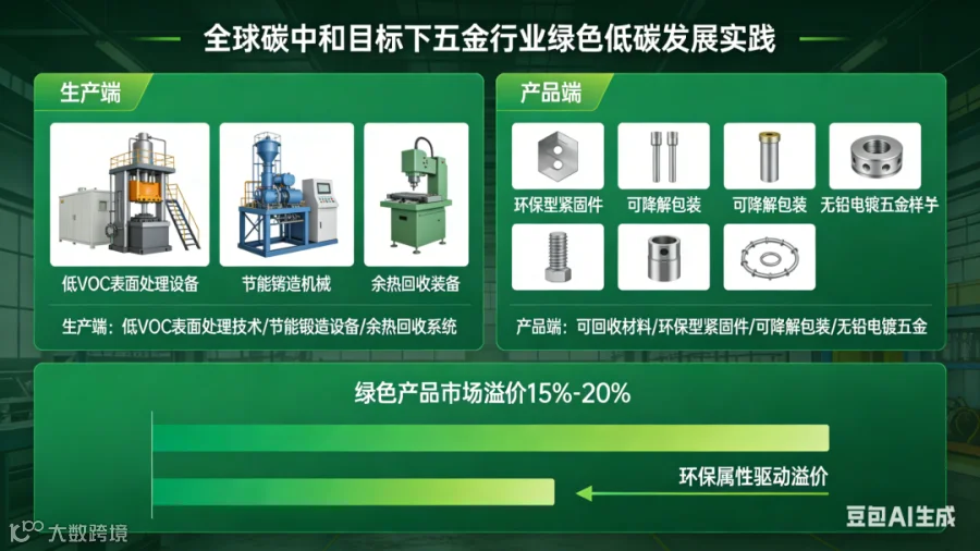 全球碳中和目标下,绿色低碳已成为五金行业的 “生存底线”,从生产制造到产品设计、使用回收,全产业链正全面践行可持续发展理念。生产端,企业广泛引入低 VOC 表面处理技术、节能锻造设备、余热回收系统,大幅降低生产过程中的碳排放与能耗;产品端,可回收材料占比持续提升,环保型紧固件、可降解包装、无铅电镀五金成为行业标配,部分绿色产品凭借环保属性实现 15%-20% 的市场溢价。