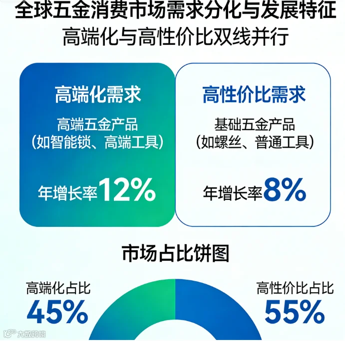 全球五金消费市场的需求分化愈发明显,高端化与高性价比双线并行成为行业发展的重要特征。在欧美、日韩等成熟市场,消费者更注重产品的品质、品牌、智能化与用户体验,高端五金产品的市场占比持续提升,品牌溢价能力显著;在东南亚、中东、非洲等新兴市场,消费者对产品价格敏感度较高,高性价比、实用性强的五金产品成为市场主流。