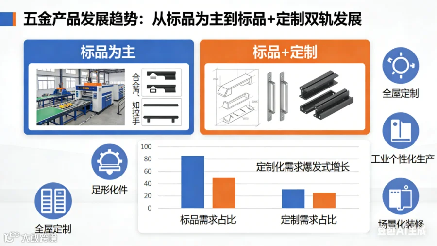随着全屋定制、工业个性化生产、场景化装修的普及,五金产品正从 “标品为主” 转向“标品 + 定制”双轨发展,定制化需求迎来爆发式增长。2026 年全球定制五金市场规模预计保持 15% 以上的增速,家具五金、建筑五金、装饰五金的非标定制需求激增,尤其是高端家装、精密制造、特殊工程领域,对五金产品的尺寸、材质、功能提出个性化要求。