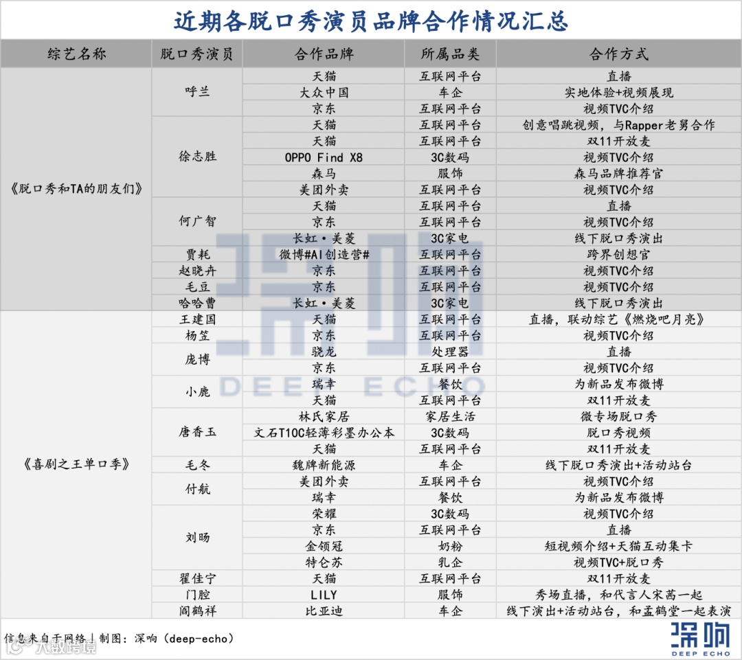 「深响」搜集整理了9月到现在两档脱口秀演员们的商务代言情况,金主们的热情扑面而来。