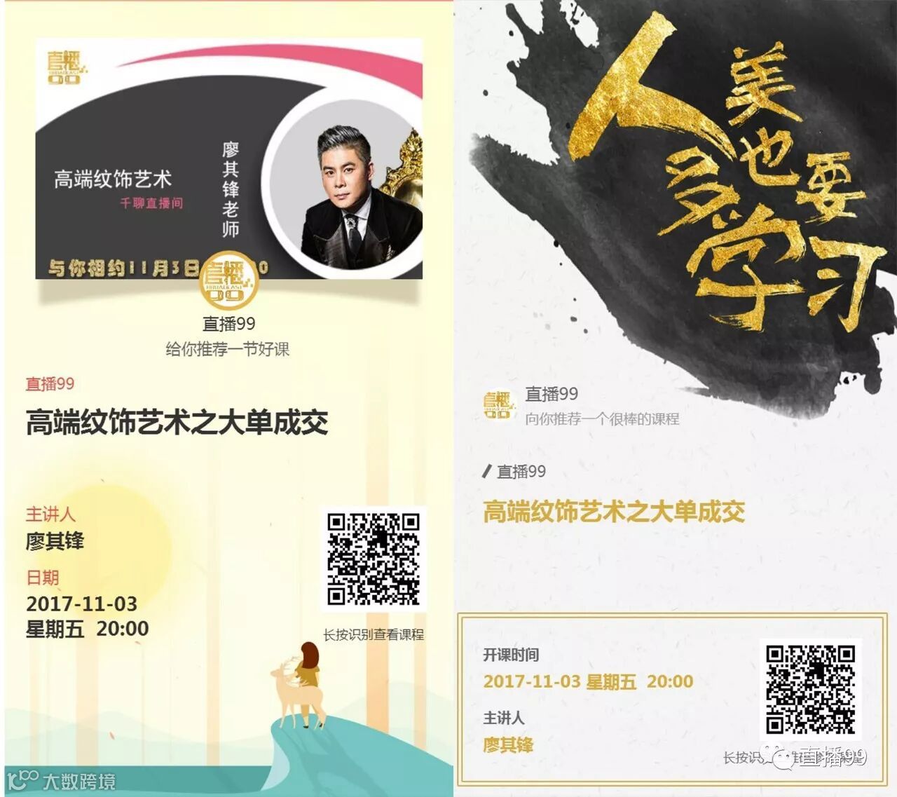 你是不是感觉顾客越来越少?是不是做纹饰顾客收不起价格?是不是感觉纹饰越来越难做?所有问题一一给您解答!11月3日,相约直播99千聊直播间,由直播99特约持久美妆灵性艺术大师廖其锋老师主讲《高端纹饰艺术之大单成交》,免费听课,20年持久美妆高端纹饰经验免费教给您,让您学会做高端,拓大客,提升纹饰艺术水平! 长按廖大师课程邀请卡,快快预定听课吧!