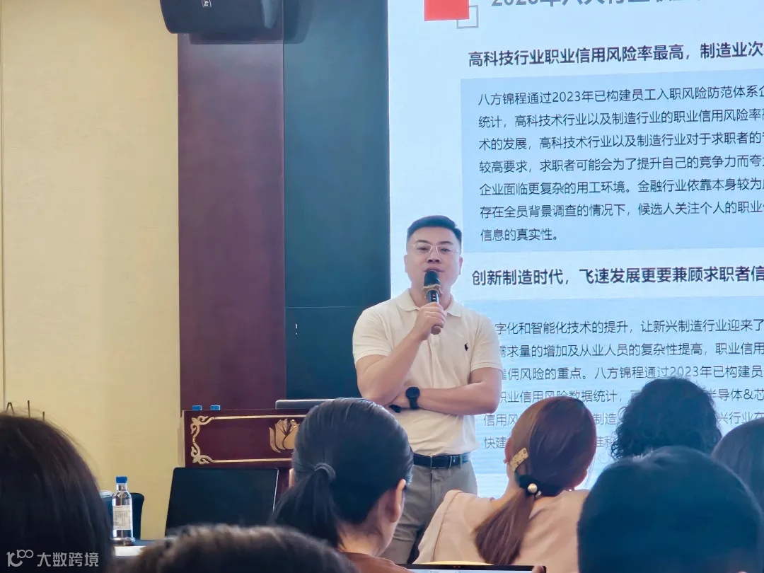 八方锦程人才研究院刘阳副院长具有专业的背景调查服务经验,从入职、在职、离职三个维度,分别阐述了白领和蓝领的用工风险,并分享了2024年职业信用风险白皮书数据,为现场的HR管理人员深入分析了背景调查在人才筛选过程中的重要性。