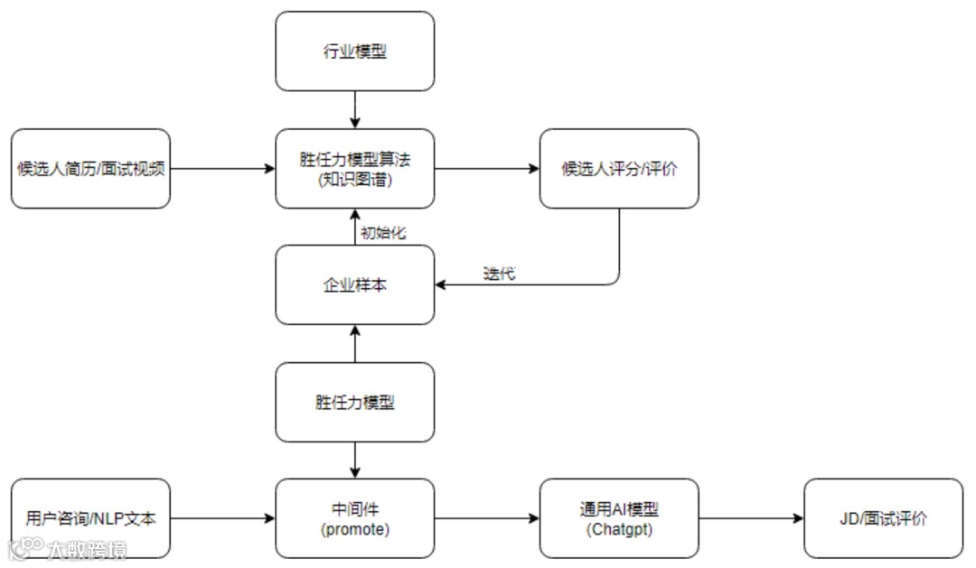 上述评价结果在经过面试官和招聘经理校正后,形成标签反馈给算法,将作为培训系统和绩效系统的输入;