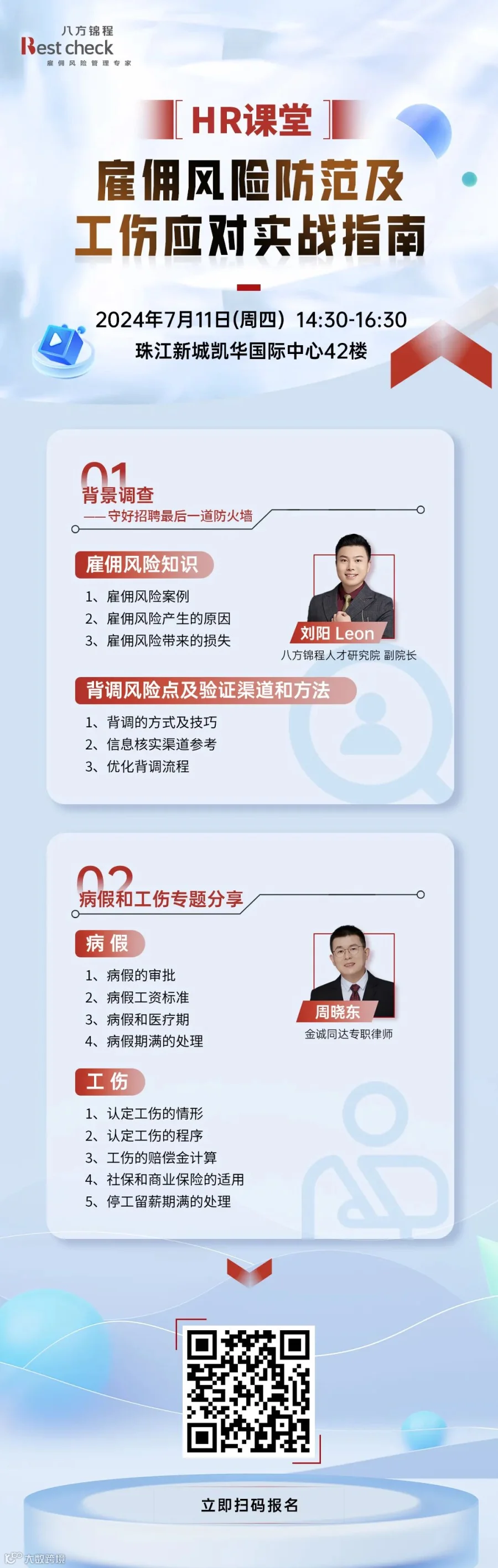 7月11日(周四),八方锦程联合金诚同达开展一场HR课堂——雇佣风险防范及工伤应对实战指南。众多实战案例,在这堂课内均有讲解,让你学完之后就能用得上。