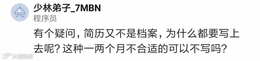 有人问,简历又不是档案,为什么所有的工作经历都要写上去?一个月的工作不写就是红灯吗?楼主说,自己也正是为此纠结生气。