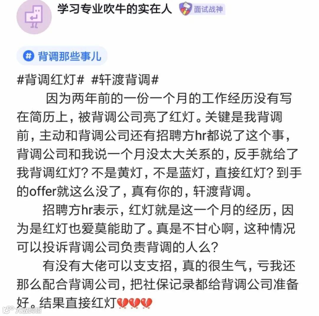 他有一份两年前、时长一个月的工作经历没写在简历上,背调前主动和背调公司还有招聘方hr都说了这个事,背调公司说一个月没太大关系,但反手就给了背调红灯,到手的offer就这么没了,招聘方hr表示爱莫能助。