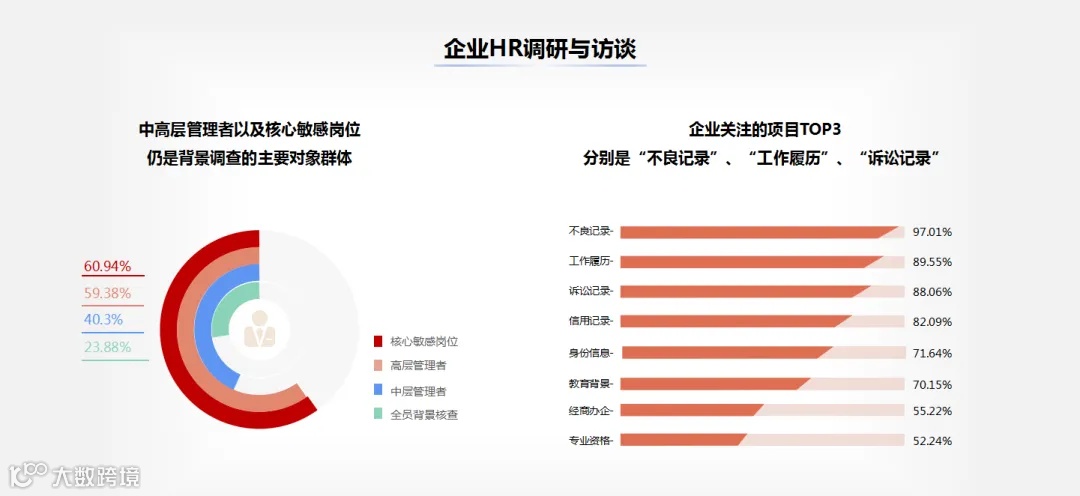 · HR定性访谈:包括背景调查的应用场景及需求、对背景调查市场发展的期望等情况。