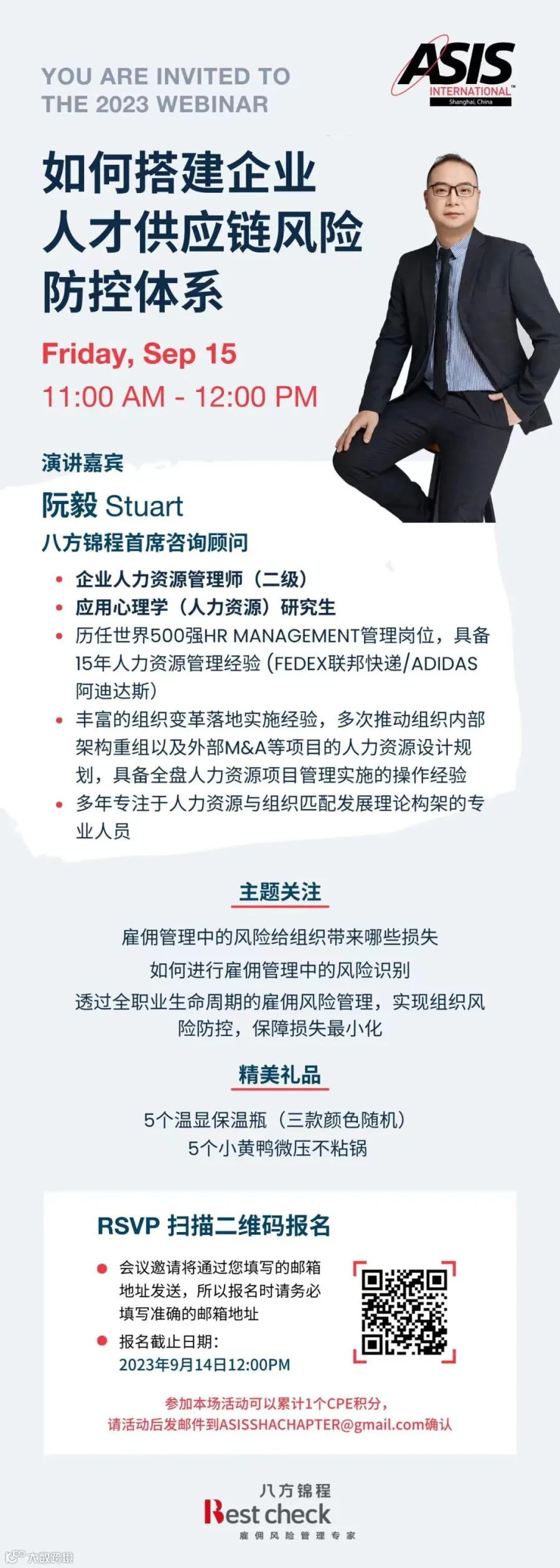 请扫描下图底部的二维码进行报名,报名时请准确提供您的电子邮箱地址,会议邀请将会提前发送到您的电子邮箱。