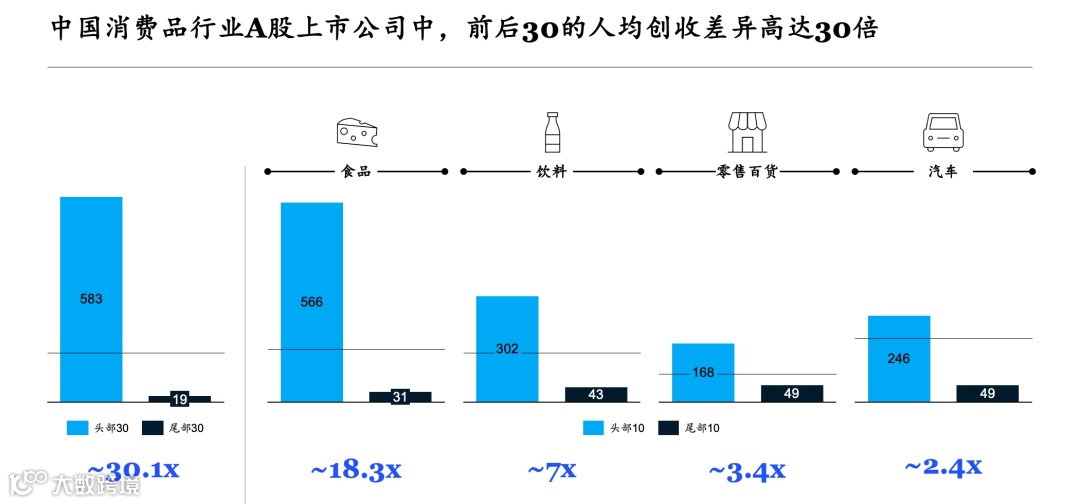 回到企业端我们会发现,在中国消费品行业上市公司中,按行业前30的和后30的企业效能对比分析,之间相差大概30倍,而从美国的上市公司去看,前30与后30之间差距大概也是2-3倍。我们可以看到在过程中,企业的质量非常重要,国外管理发展这么多年,质量相对来讲比较平均。