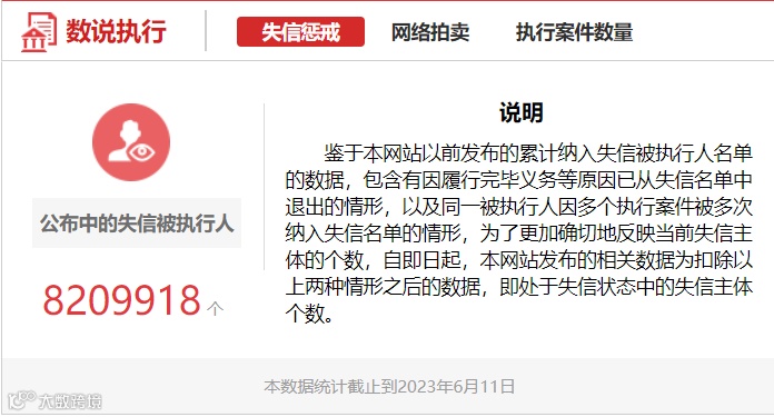 根据最高法执行信息公开网的数据显示,截至目前(如下图),我国公布中的失信被执行人达8209918个,同比2022年增加约70万人,新收案件量7194000件,已结案件量5449501件。