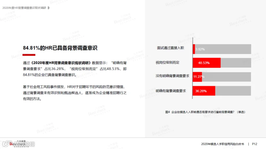 即使如此,国内企业对于背景调查的意识却在不断提高之中。根据《2020年度HR背景调查意识现状调研》数据显示,约84%的企业“具备背景调查意识”。