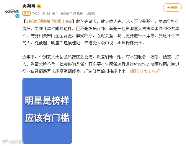 央视网发表一则评论“把做明星的门槛提上来”评论中,曾提到“有必要对失德劣迹者进行针对性的制度约束,通过行业自律倒逼艺人提高道德修养”。