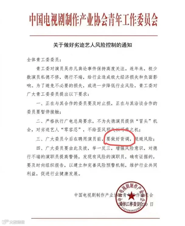 与此同时,中国电视剧制作产业协会青年工作委员会发布了《关于做好劣迹艺人风险控制的通知》,其中第三条写道:广大委员今后在聘用演员前,要做好背调,规避风险。