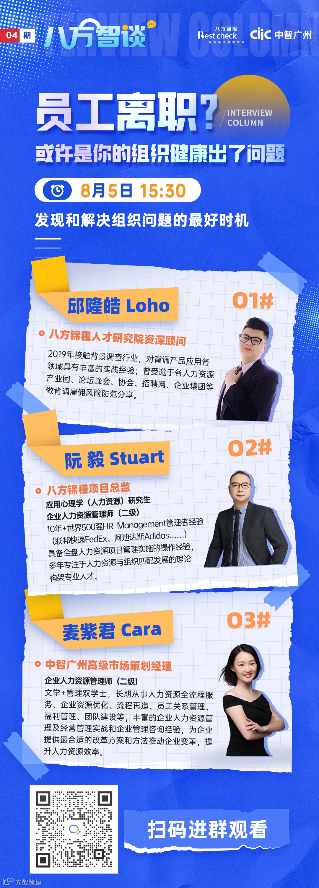 【八方智谈】第四期将邀请八方锦程项目总监阮毅、八方锦程人才研究院资深顾问Loho、中智·广州高级市场策划经理麦紫君,结合人力资源管理的实际工作心得,梳理一些当下离职常见的原因,并通过探寻离职原因,给予HR在处理人力资源管理的问题一些建议。