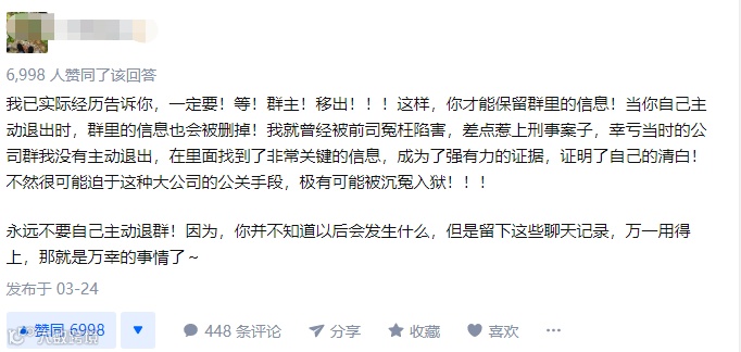 事件起因是一位网友离职后被公司冤枉,差点惹上了刑事案件,但好在当时离职时不是她主动退出的公司微信群,所以聊天记录得以保留,然后也在群里找到了强有力的证据,最终证明了自己的清白。