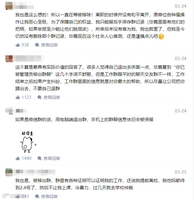 因此她呼吁大家离开公司后一定要等群主把自己移出去,而不是自己主动退出。