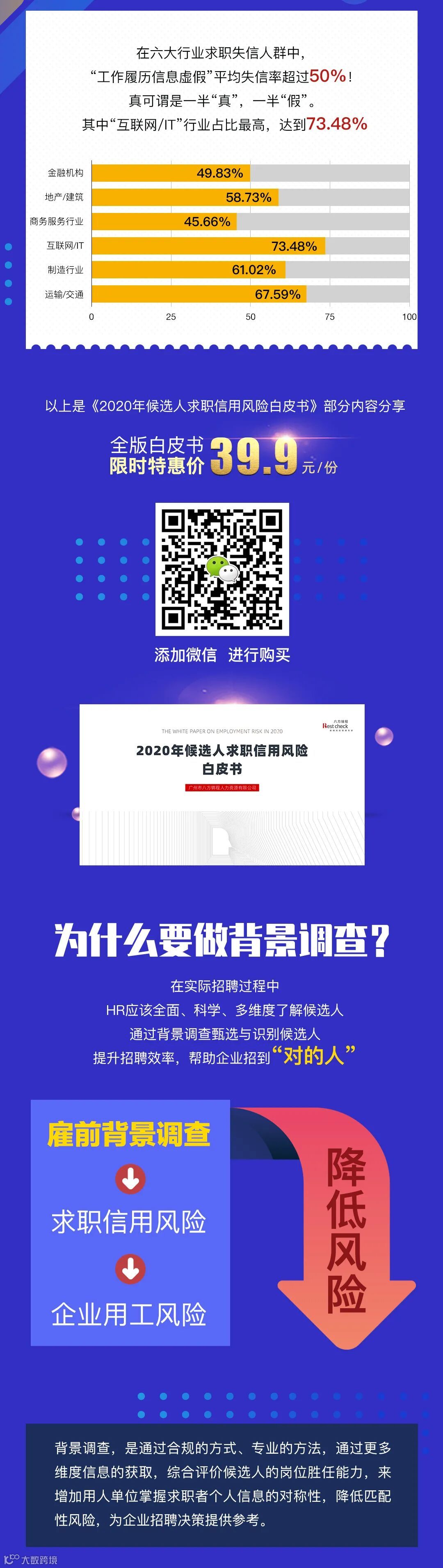 为了帮助企业更好、更全面地了解当下候选人的求职信用状况,《2020年候选人求职信用风险白皮书》从八方锦程所服务的5000多家企业、816份HR市场调研报告、9840家企业HR主动咨询数据出发,为HR揭开了候选人在求职时所容易遇到的“风险点”。