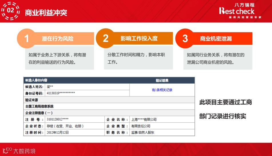 对于如何核查候选人的商业利益冲突,八方锦程在微课《5大基础信息核实——全方位解读具体操作细节》中讲述,存在商业利益冲突,所存在的潜在行为风险、影响工作投入度、商业机密泄漏等风险,以及商业利益冲突的核查方法。