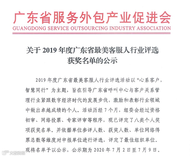 2019年度广东省最美客服人行业评选活动,历经七个月,经过资格初审、网络投票、专家评审等,评定出“行业接触贡献奖”、“优秀运营管理奖”、“优秀培训师”、“精英客服奖”等八类个人奖项。