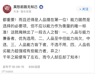 “德才兼备,以德为先,任人唯贤”,有大部分人认为人品比能力重要,人品会影响整个团队,无才可以培养,无德要果断弃用。