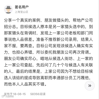 有位来自上海的HR在智联招聘职Q社区分享了一个真实的案例,他说,有一家房地产公司委托猎头公司A招聘分公司总经理,猎头公司锁定目标侯选人并对其背调,背调中,目标侯选人的上家公司老板和部门评价其人品很差。但该房地产公司发现该侯选人确实实力出众,也担心背调有误,所以,又委托了另一个猎头公司B再次背调,猎头B通过暗地走访以及针对目标侯选人的其它前任雇主摸排,最后得知,其人品很好。他的上家公司无故克扣目标侯选人导致其离职,其老板和前同事故意评价其人品不好。