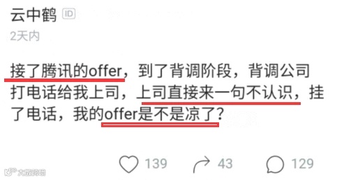 另外,小八在某论坛看到这样一个热门的帖子,一位候选人写道:“接到腾讯offer,背调时上司直接来了一句'不认识',offer是不是要凉凉了?”