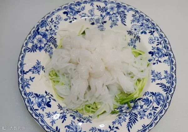 6. 将切好的黄瓜丝摆在盘子底部,魔芋丝沥干水摆在黄瓜丝上面