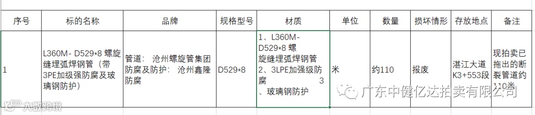 标的一、受损输油管道预计15吨,参考价:¥2800元/吨,保证金:¥10000元。