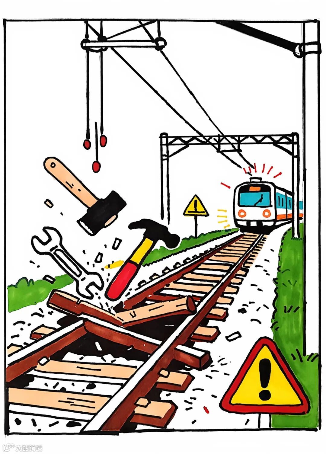 作品内容:坠落的工、机具砸伤轨道、接触网,影响行车运行安全。