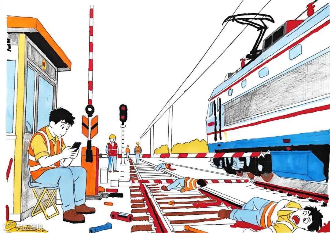 作品内容:施工作业时,漏设防护,防护信号设置错误,防护员擅自离岗,工作时玩手机,防护作用失效,现场作业人员无法及时收到列车预警,导致施工人员伤亡,线路中断。