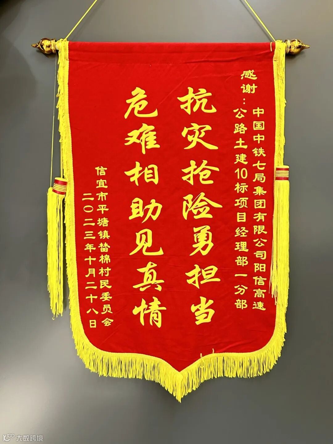 近日,信宜市平塘镇榃棉村民委员会为中铁七局广州公司阳信一分部送上“抗灾抢险勇担当 危难相助见真情”锦旗。阳信一分部多次协助当地村民开展巡防警戒、涉险隐患排查、村民避险疏导等防汛处置任务,积极履行社会责任,充分展现新时代铁军的使命与担当,全力保障群众生命财产安全。