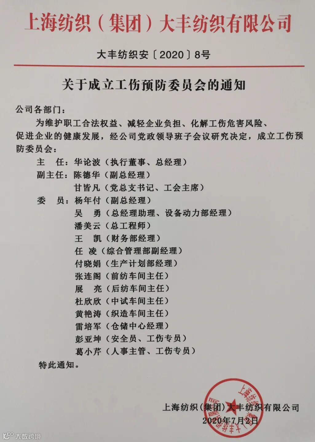 近日,盐城市人社局领导郭维柱携下辖各市县人社部门领导在大丰区人社局副局长吴卫陪同下莅临上海纺织(集团)大丰纺织有限公司,对我司工伤预防工作进行现场检查指导。