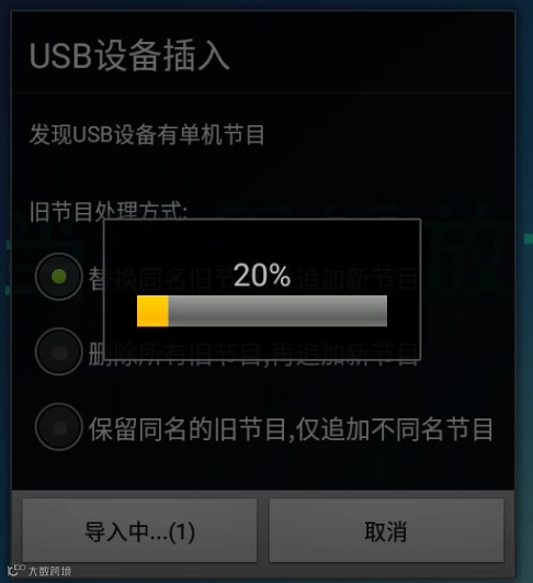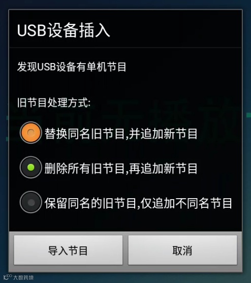 只需将已经制作好单机节目的U盘插入已经开启单机模式设备的USB口中,即可看到下面的提示:
