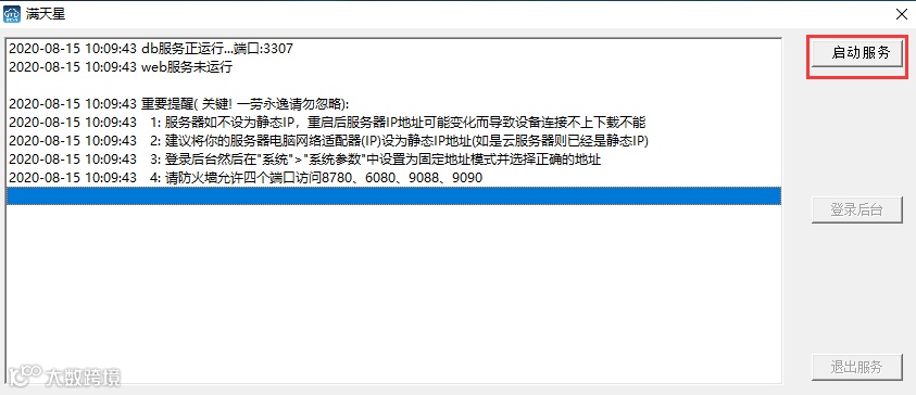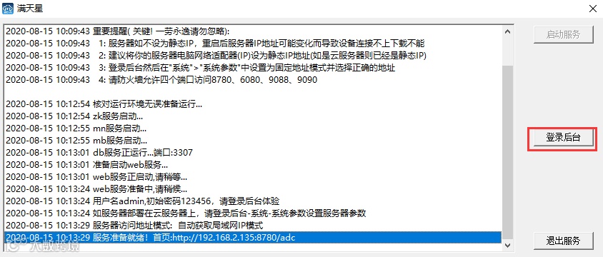 当你看到"服务准备就绪",就证明已经启动好啦,可以点击“登录后台”打开后台管理页面