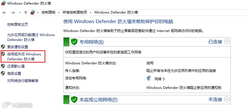 然后点击"启用或关闭 Windows Defender 防火墙"