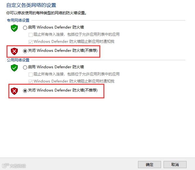 然后关闭所有网络的防火墙并点击"确定"即可: