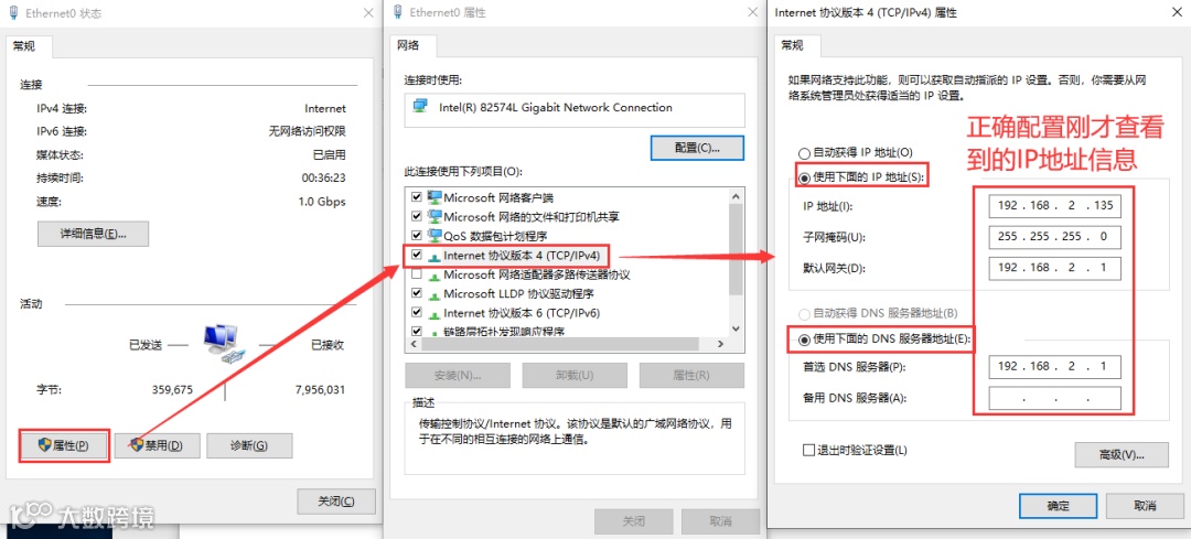 随后关闭“网络连接详细信息”窗口,点击“属性”打开属性配置IPv4的属性,如下图:
