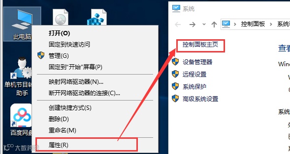 在桌面“计算机”或“此电脑”上右键->点击"属性"->点击"控制面板主页"打开控制面板:
