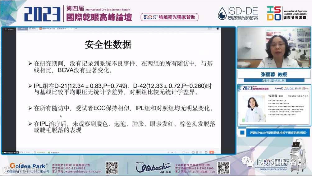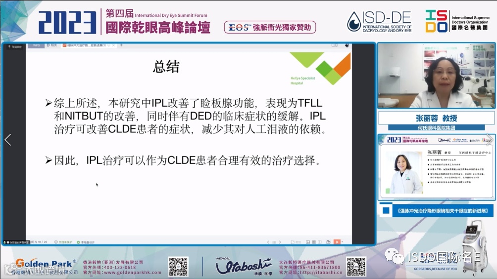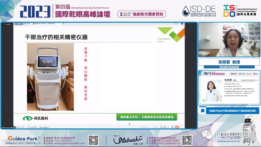 在2023第四届国际干眼高峰论坛上,张丽蓉教授在她的课题里分享了她们团队使用EOS超级光子MCP4治疗系统,开展关于“强脉冲光治疗隐形眼镜相关干眼症”的研究成果。