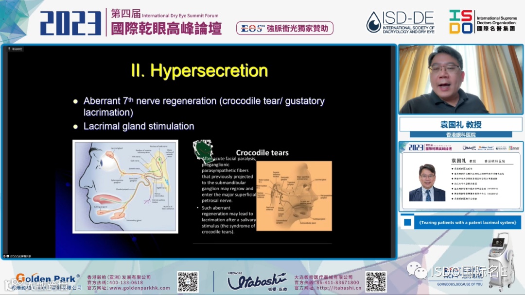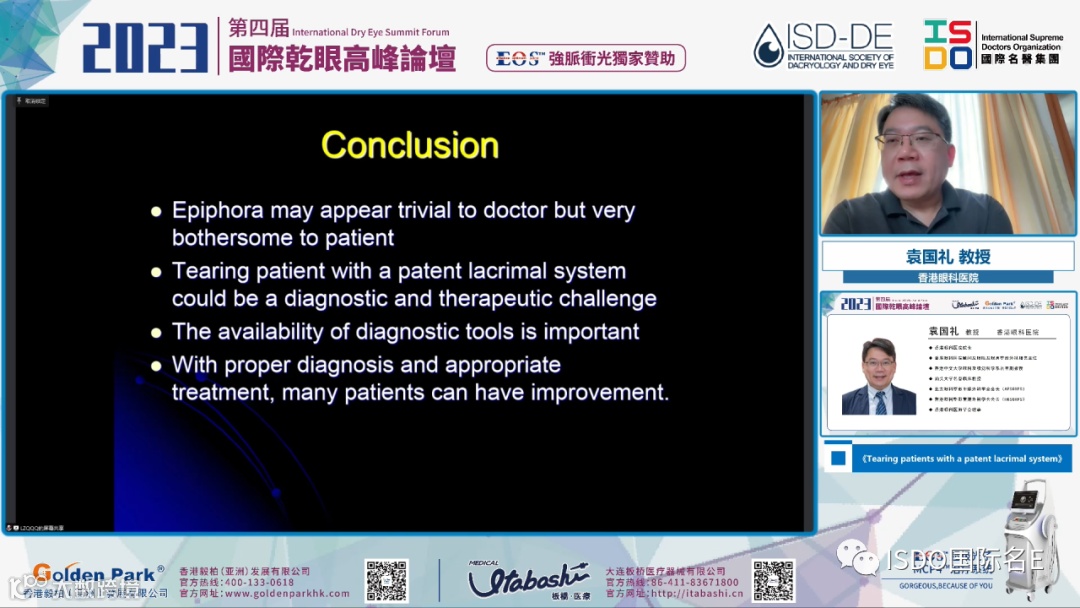 在2023第四届国际干眼高峰论坛上,ISD-DE副主席袁国礼教授的《Epiphora with a patent lacrimal system》,详细介绍泪道系统未闭患者的治疗方法、治疗效果等。