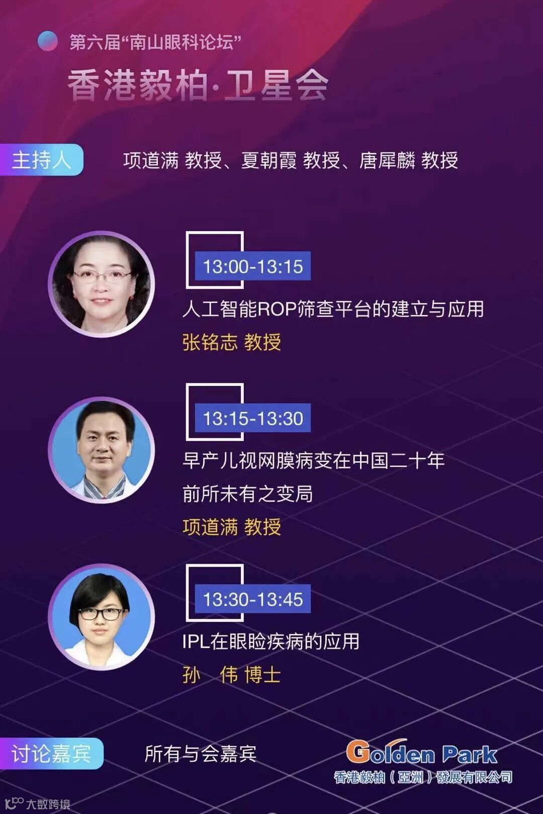 香港毅柏独家赞助的午餐卫星会,请来了汕头国际眼科中心常务副院长张铭志教授、广州妇女儿童医疗中心眼科主任项道满教授、广东省保健协会视觉保健分会小儿眼病学组副组长孙伟博士,为各位专家教授讲述《人工智能ROP筛查平台的建立与应用》、《早产儿视网膜病变在中国二十年前所未有之变局》、《IPL在眼睑疾病的应用》三个课题,展示目前儿童眼病的最新科研成果。并与各级医师、眼科界同行一起讨论ROP筛查、AI人工智能平台及IPL应用这三个热议话题。