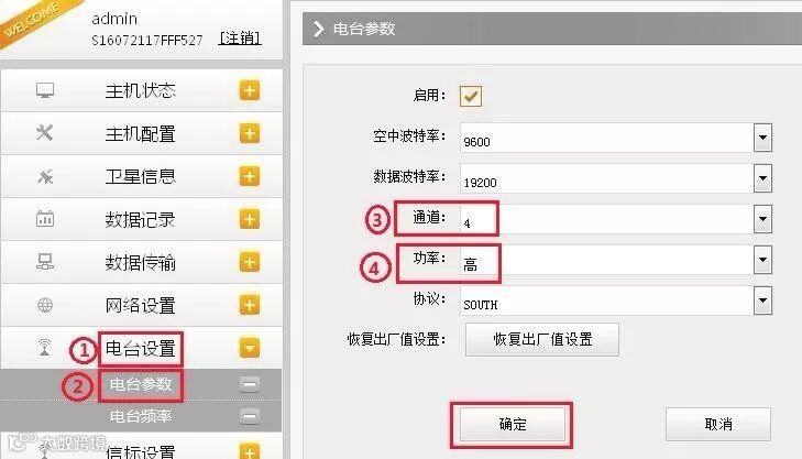 (1)“通用设置”设置主机模式为“基站”数据链选择“电台”。