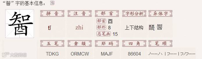 䣽(zhi/ti):䣽(zhi)同“知”,䣽(ti)同“醍”知者知也,醍者有色的酒;康熙字典收录,说文解字注释为:酒也、醇厚的酒;汉字简化后与“知”“醍”同义新华字典未与收录使用。