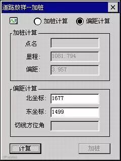 选择“偏距”,然后输入坐标X 和坐标Y,按“计算”就计算出该坐标点对应于该线路上的偏距和里程,如果不在范围内就给出提示。