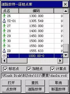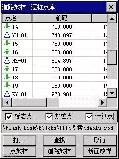 选择要放样的点,如果要进行整个线路放样,就按“道路放样”按钮,进入线路放样模式进行放样;如果要对某个标志点或加桩点进行放样,就按“点放样”按钮,进入点放样模式。
