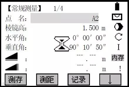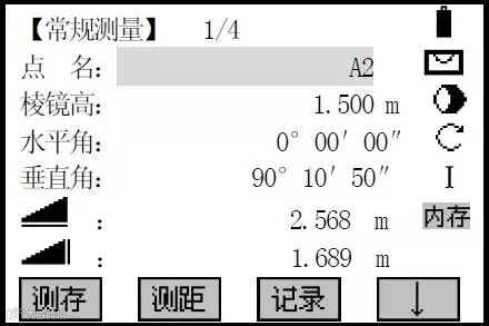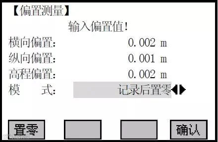 ✪⑥若选择记录后置零:当用[测存]启动测量,程序会显示该测量结果加上偏置改正后(即目标点)的数据,待再一次启动测量,则显示该测量点的真实值。