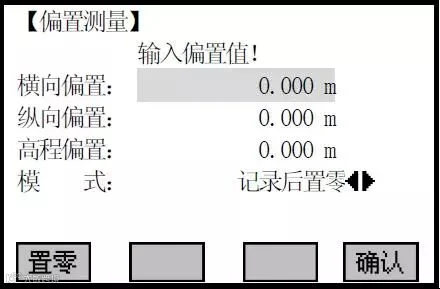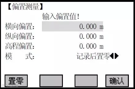✪②按[F2]进入偏置测量功能。输入偏置值(纵向、横向及高差等偏差值),并确定偏置值的应用时效。输入完一项按ENT 键将光标移到下一输入区。